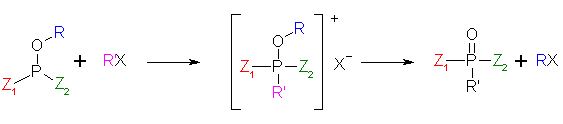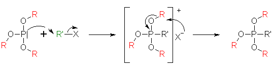 This reaction gives pentavalent alkyl phosphoric acid esters by treatment of trivalent phosphoric acid esters with alkyl halides. As an example, the mechanism for phosphorous acid esters is shown below.